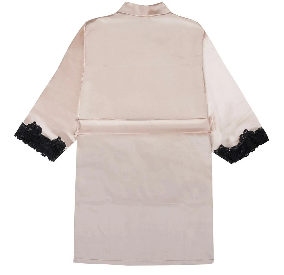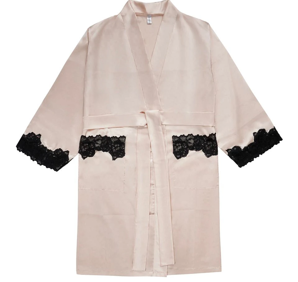 Hermosa Bata realizada en satén y puntilla elastizada. Delicada, cómoda y con aires retro. Detalles en bolsillos y mangas. Cinturón amplio para ajustar en la cintura.