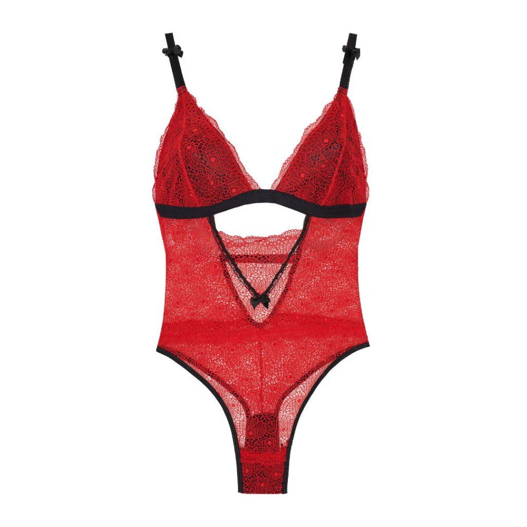 Body: de puntilla con busto triangulo forrado en algodón. Cuenta con breteles regulables. La espalda cuenta con dos breteles regulables desmontables. Detalles de puntilla fina rígida en los inicios de breteles y con decoración de moños en las terminaciones. La parte trasera es less y la materialidad es de puntilla.