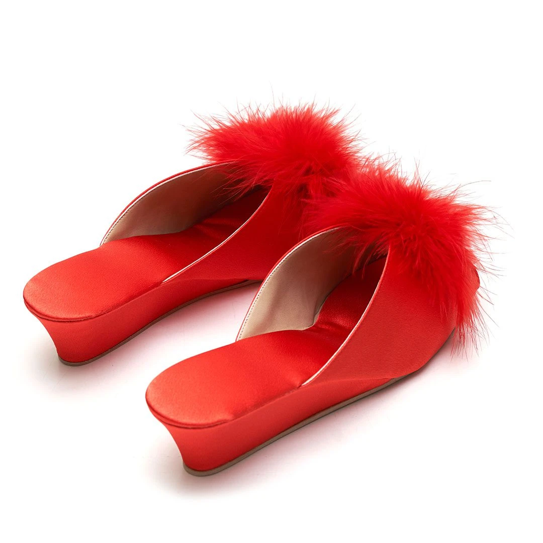 Chinelas taco chino forradas en satén con detalle de pompón.