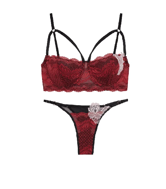 Conjunto de corpiño con arco de puntilla forrado con algodón, en una de las tazas cuenta con un aplique de puntilla de una flor. En el escote cuenta con tres breteles en cada lado y luego puntilla y tul. Espalada regulable. Microbikini regulable congeccionada con puntilla y microtul.