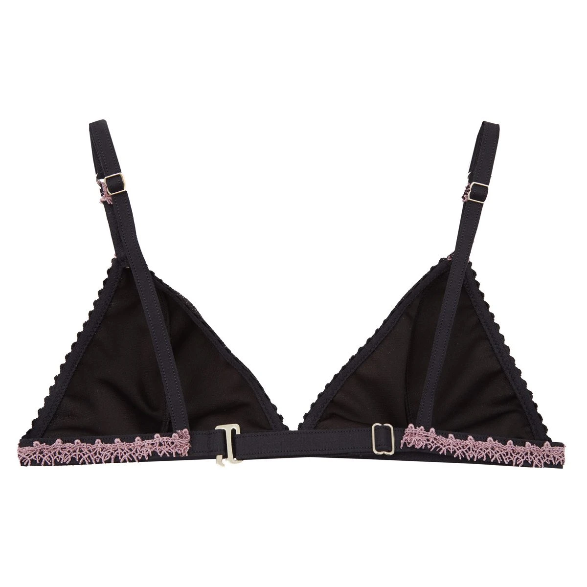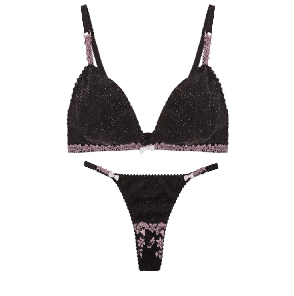 Conjunto de lurex, un genero con un leve brillo muy fino y sofisticado. Acompaña la bombacha cola less regulable. Laterales con delicados detalles de moños.
